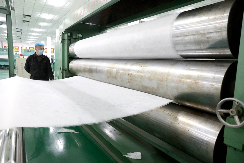 新冠肺炎疫情发生以来,石家庄市灵寿县通过对外贸企业的帮扶,及时解决实际困难,落实各项惠企政策,在做好疫情防控的同时,助力当地外贸企业有序复工复产,保障国内外市场需求。图为位于河北省灵寿县的益生环保科技股份有限公司生产车间,工人在生产热风棉。新华社记者 梁子栋/摄