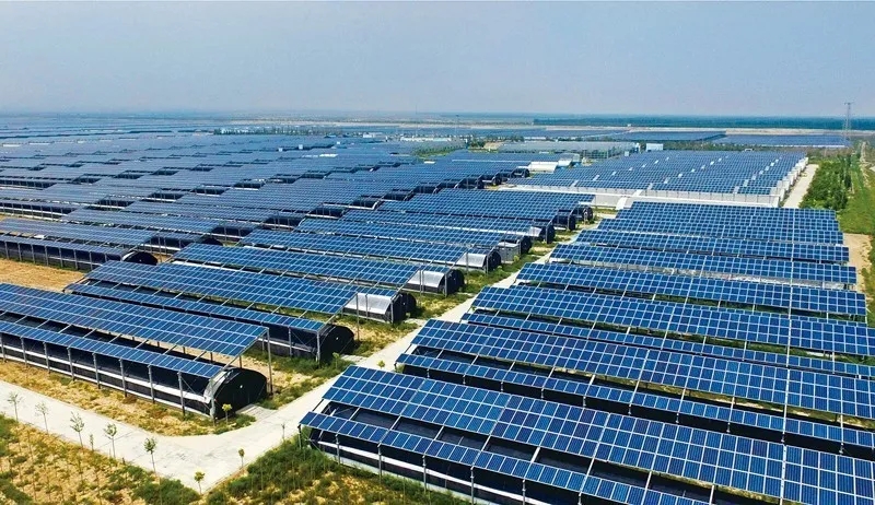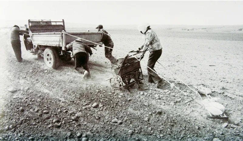 上图为宁夏永宁县闽宁镇建设初期,移民群众在戈壁滩上开荒种田(资料照片 新华社发)。下图为闽宁镇原隆移民村的光伏蔬菜大棚(新华社记者 王鹏/摄)。
