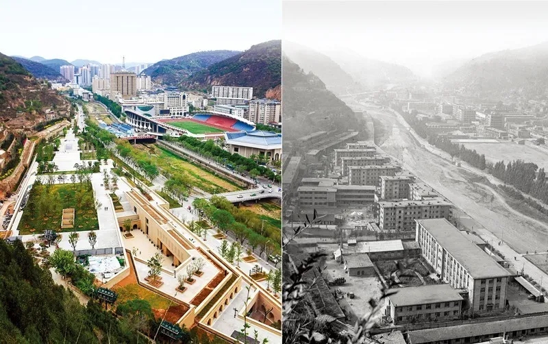 这是一张拼版照片,左图为2019年5月5日拍摄的延安市南河河道(新华社记者 刘潇/摄);右图为1983年12月26日拍摄的延安市南河河道(资料照片)。