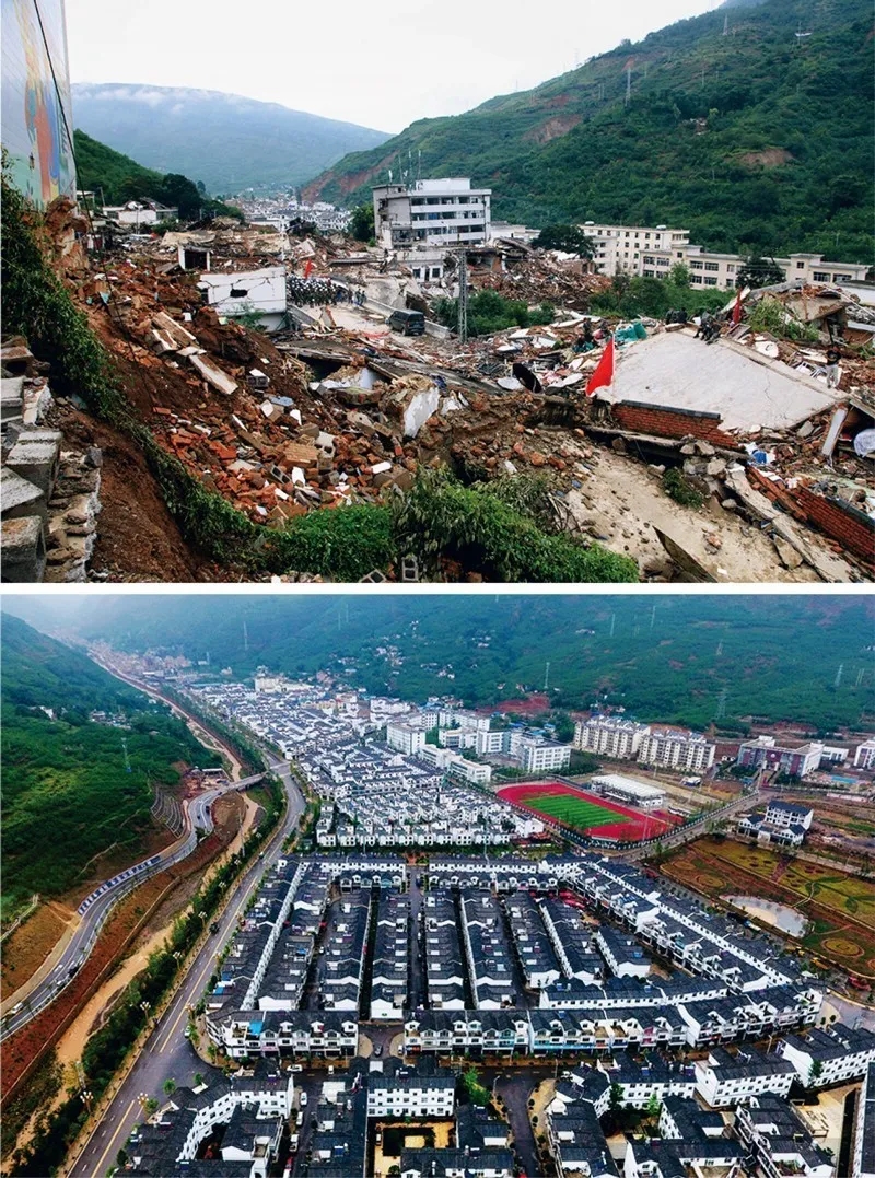 2014年8月3日,云南昭通市鲁甸县发生6.5级地震,群众生命财产和基础设施遭受巨大损失。在党中央的关怀下,鲁甸把灾后恢复重建和打赢脱贫攻坚战相结合,使龙头山镇不仅获得了重生,还摆脱了贫困,实现了生产生活大变样、社会事业大跨越、基础设施大提升、产业结构大调整。上图为地震灾后的龙头山镇(张广玉/摄);下图为恢复重建后的龙头山镇新貌(丁世新/摄)。昭通市委宣传部供图