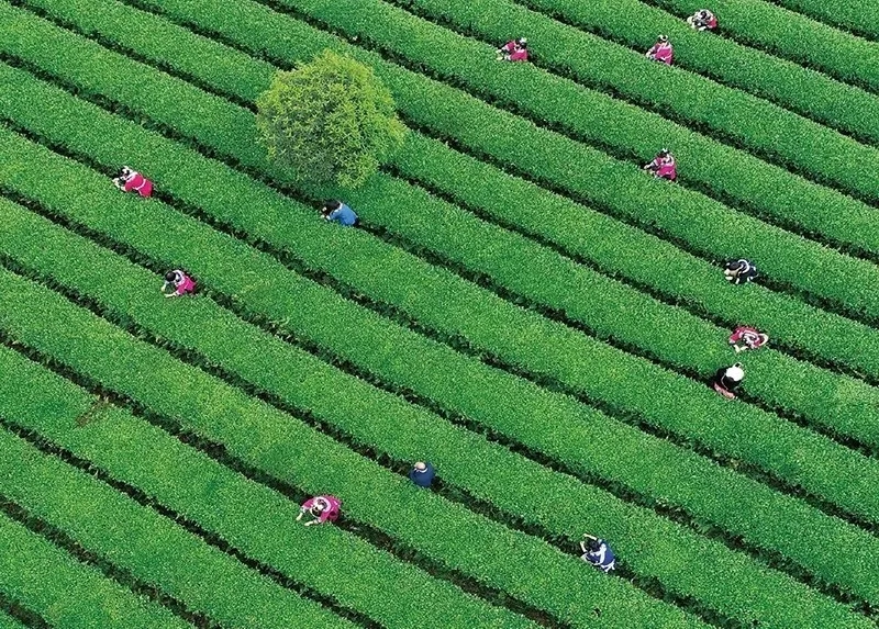 贵州省纵深推进农村产业革命,发展十二大特色优势农业产业。图为2020年4月19日铜仁市松桃苗族自治县普觉镇的茶农们正在茶园采摘茶叶。松桃县融媒体中心 龙元彬/摄