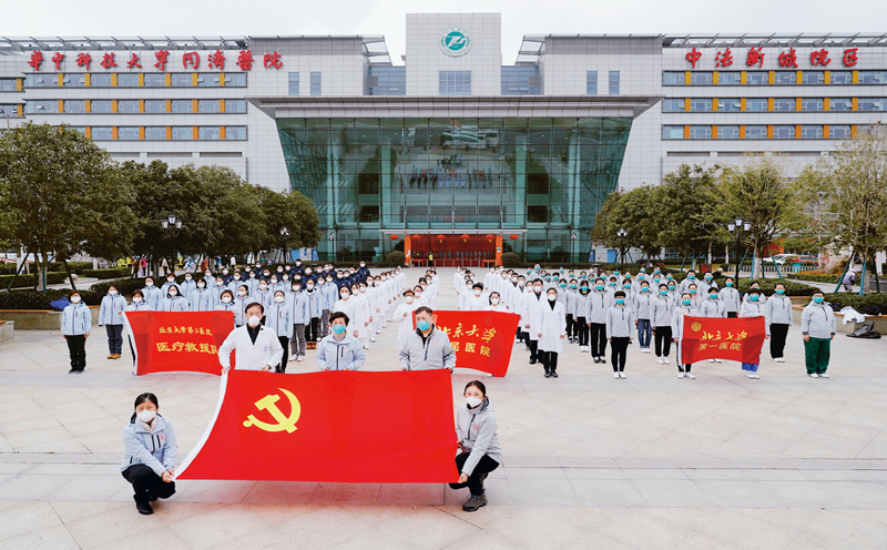 2020年3月1日,在华中科技大学同济医院中法新城院区,北京大学第一医院、北京大学人民医院、北京大学第三医院医疗救援队的党员和入党积极分子代表重温入党誓词。 新华社记者 沈伯韩/摄