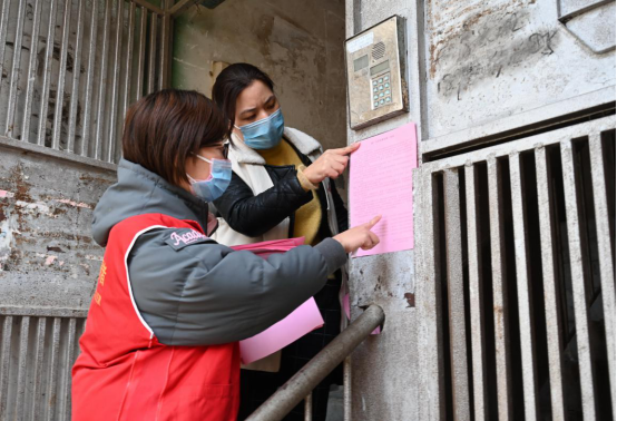 2月1日,党员志愿者朱嘉希(左)和福州市鼓楼区五凤街道龙泉社区书记高玉芳在福州市鼓楼区崎上路的一处居民楼张贴《致广大居民朋友的一封信》,宣传做好新冠肺炎疫情的防控工作。 新华社记者 林善传 摄