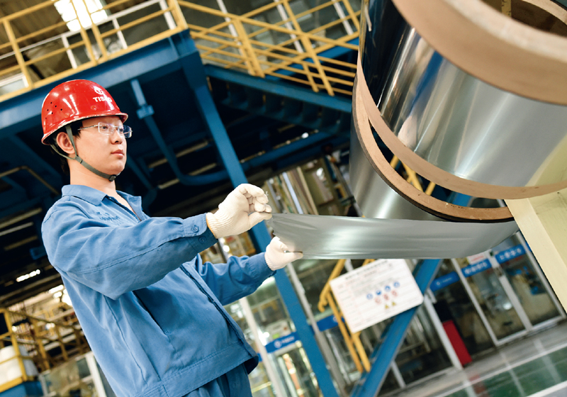 山西坚定贯彻落实习近平总书记关于创新驱动、科教兴国、人才强国的重大战略思想,手撕钢、碳纤维、碳化硅等技术创新取得重大突破。图为太钢集团生产车间正生产手撕钢。山西省委宣传部供图