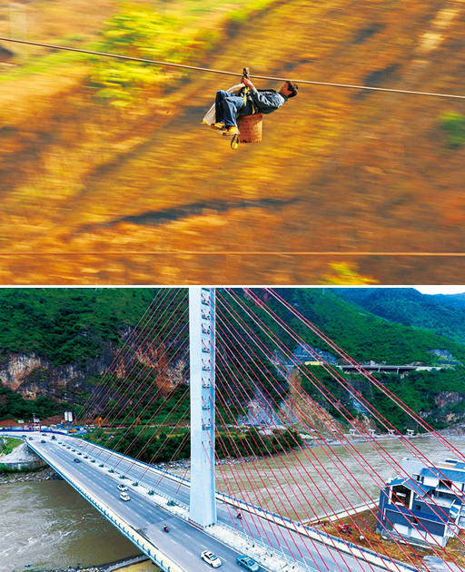 云南省怒江傈僳族自治州98%以上的国土是高山峡谷,山势陡峭,过去群众要依靠溜索跨越怒江,出行极为困难。如今,怒江傈僳族自治州交通状况得到极大改善,许多溜索被桥梁所取代。上图为2013年2月2日拍摄的泸水市六库镇双米地村的一名村民从集市上采购年货归来,依靠溜索过怒江(新华社记者 王长山/摄)。下图为2016年9月9日拍摄的双向六车道大型公路跨江桥梁——通达桥(新华社记者 胡超/摄)。
