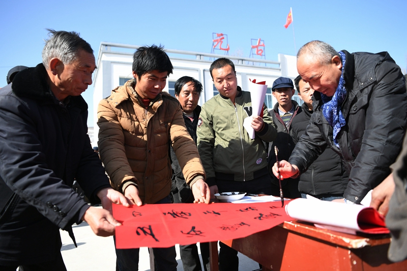 2018年2月11日,甘肃省定西市渭源县元古堆村村民闫霞亮(左二)在村文化广场参加写春联、送春联活动。新华社记者 陈斌/摄