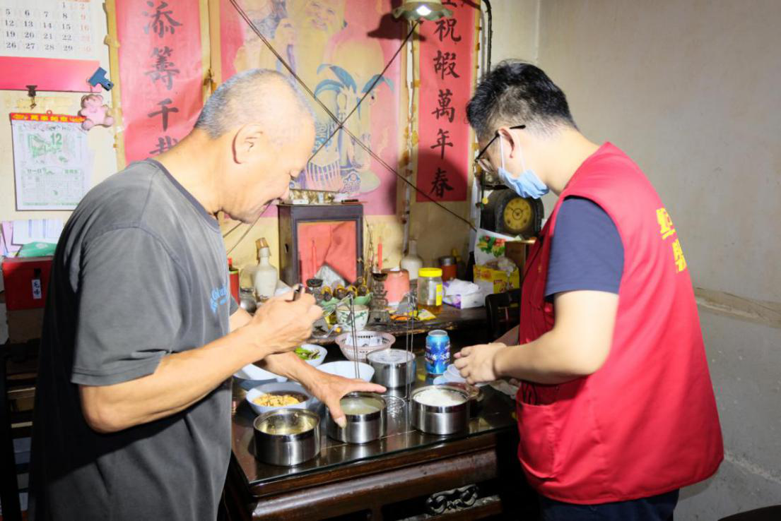 志愿者将“爱心餐”送至老人手中。