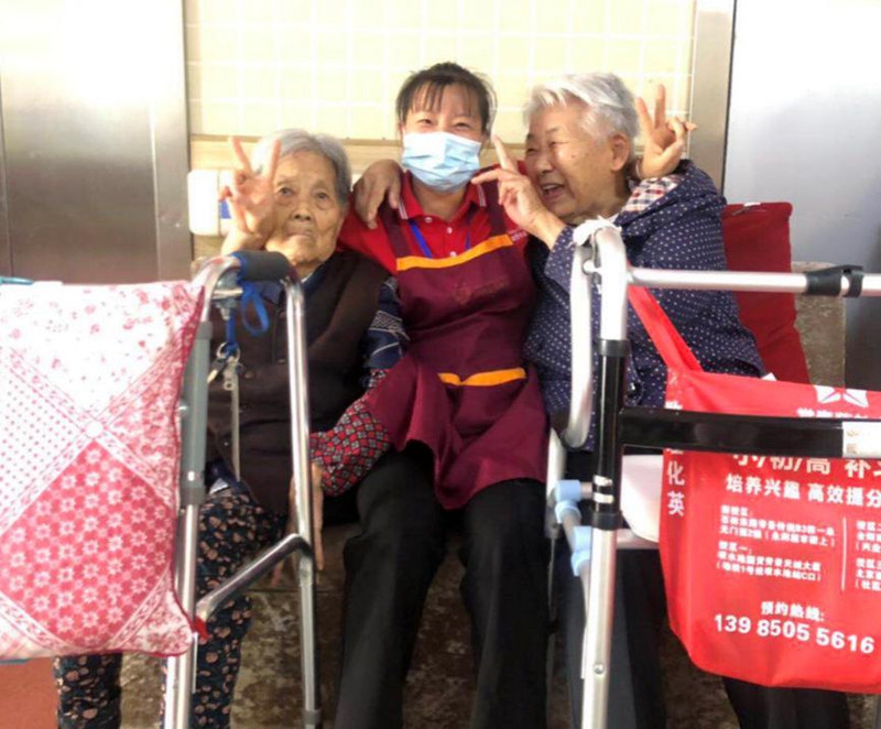 尹朝梅一大早就忙开了。尹朝梅是养老服务中心的老员工了,和40多名照护师一起照顾着这里近300位老人的日常生活。“比子女还亲,我们24小时在老人身边”,尹朝梅搀扶着86岁的杨树兰老人和85岁的蒋广学老人走出了电梯,她说,“老人在这里有专门的医疗服务,我们也随叫随到。(老人)跟我们特别亲”。