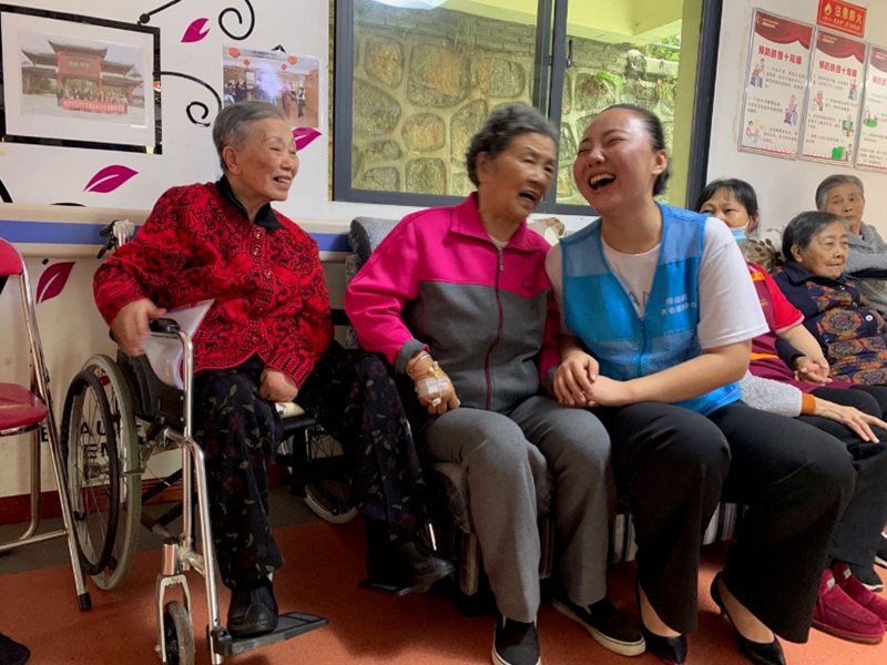 除了照护师,这里还有养老行政、后勤、安保等,共计100多名工作人员。今年22岁的小彭,是贵州大学商务英语专业的毕业生。因为外公的原因,她想要了解养老这个行业,应聘进入服务中心,现在已经通过应聘考核进入试用阶段了。她认同这里养老护老的理念:用员工的微笑和爱,换取老人微笑、家人微笑。