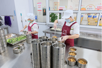 图为工作人员将已烹制好的午餐,整齐有序地分盛进不锈钢饭盒中。