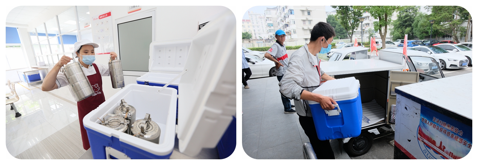 图为工作人员将不锈钢饭盒装进保温箱内。随后,顺丰速递工作人员接力,将打包好的饭菜送到各社区门口。
