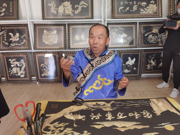 2020年6月13日,黑龙江省非物质文化遗产传承人孙玉林在讲述制作鱼皮画的技巧和流程。郭煦/摄