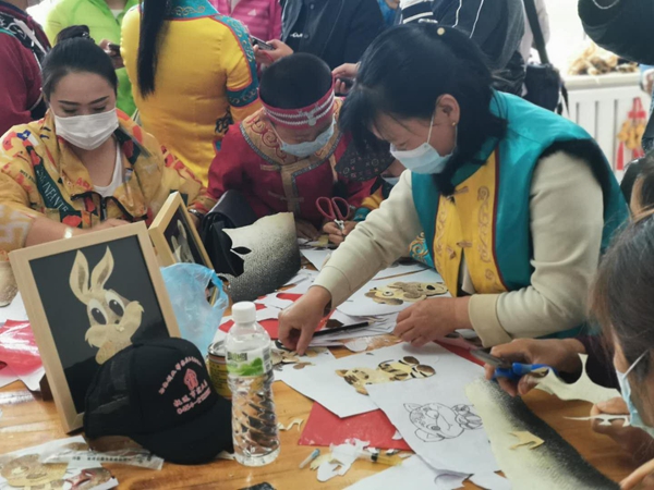 2020年6月14日,抓吉赫哲民族风情村的文化活动室,村民和小学生们正在学习制作鱼皮画。 盛玮/摄