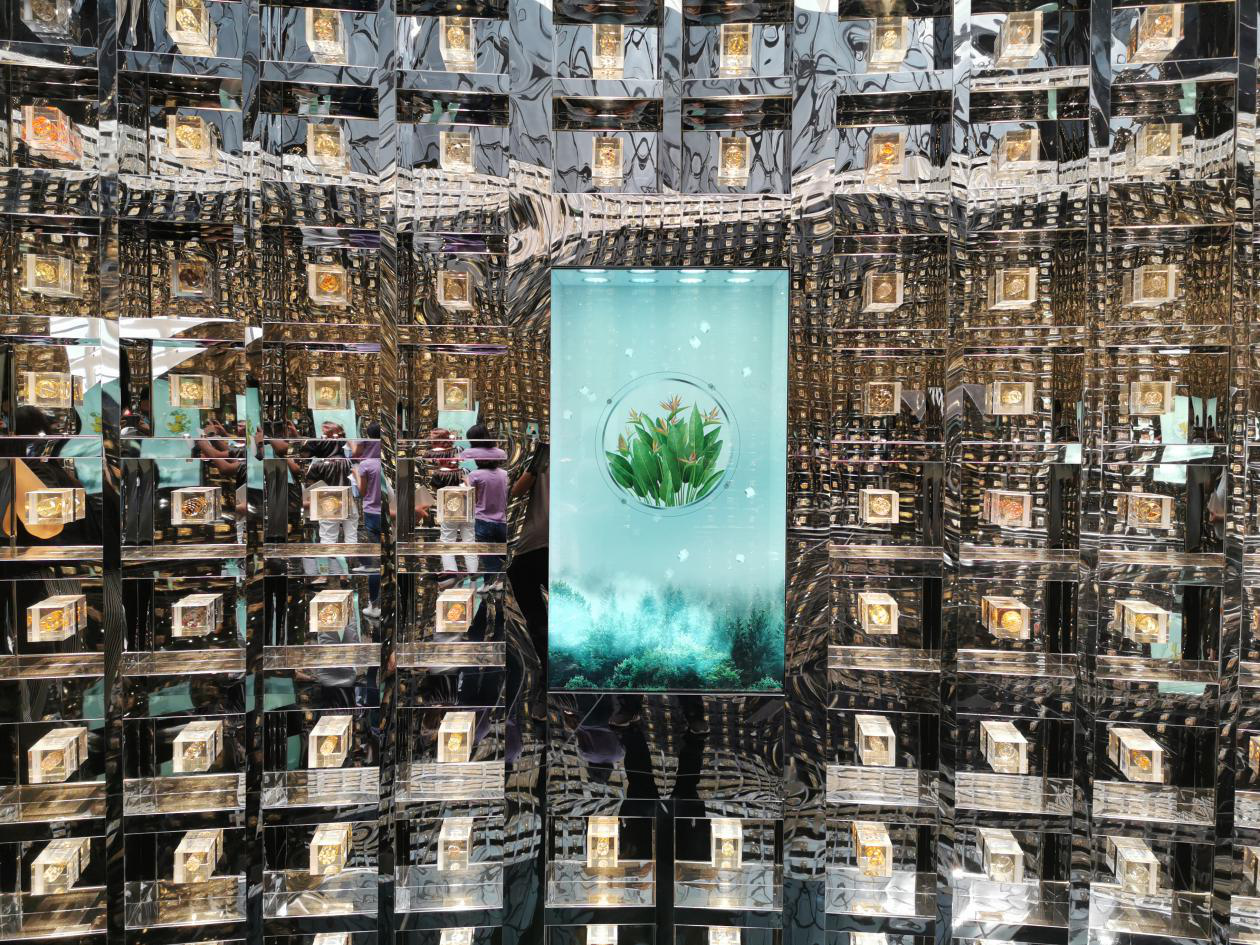 在讲解员深入浅出的讲解下,记者了解到,此地原本比较荒凉、植被较少,通过“低成本、低维护、四季有景”的近自然手法,重塑了山地森林景观,将区域森林覆盖率从原有的35%提升至85.7%。生态打底,文化汇聚,金沙文化、川西文化等天府文化和中国古代建筑文化深度融合,巧妙地体现在了丹景台、丹景阁、丹景亭三处特色功能建筑上。从丹景台一楼到三楼,依次设置了展览展示、生态研学、科普教育等不同功能的互动区域和设计,形式巧妙、内容有趣,高科技赋能、沉浸式体验让人全身心投入。