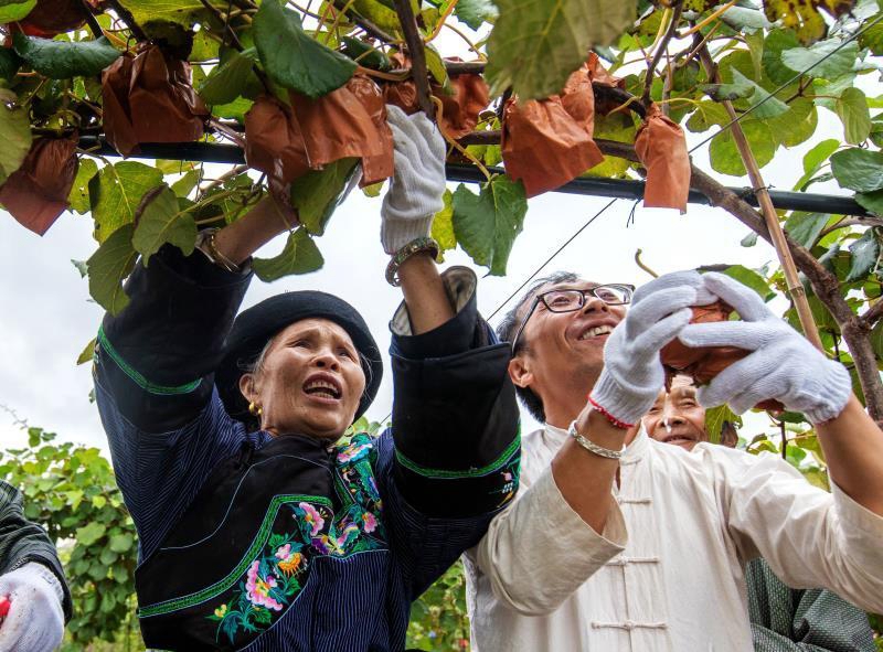 十八洞村盛产红心和黄心猕猴桃,十八洞村民看见猕猴桃挂果,开心地笑了。湘西州委宣传部供图