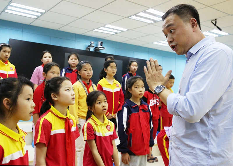 湖南科技大学音乐系教授王育霖志愿担任留守儿童合唱团团长,3年多来,他每周往返湘潭和祁东,精心指导合唱团的孩子们。启航学校供图