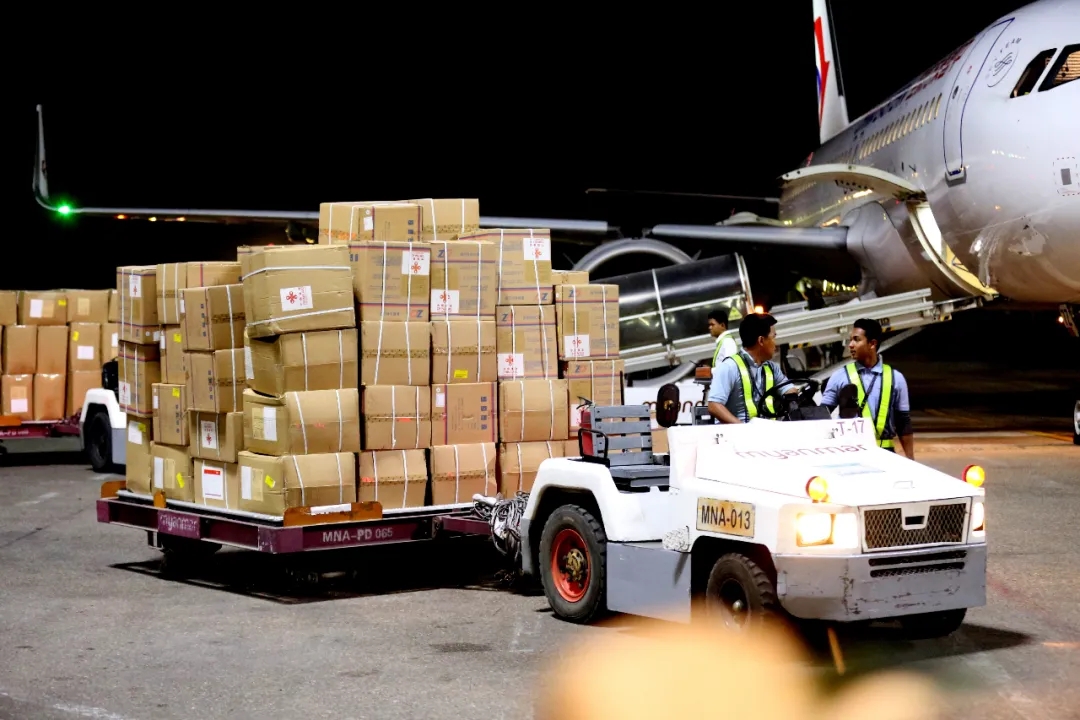 2020年3月26日,一批中国政府援助的抗击新冠肺炎疫情物资运抵缅甸最大城市仰光。图为在缅甸仰光,机场工作人员正在卸载中国援助物资。新华社发(吴昂 摄)