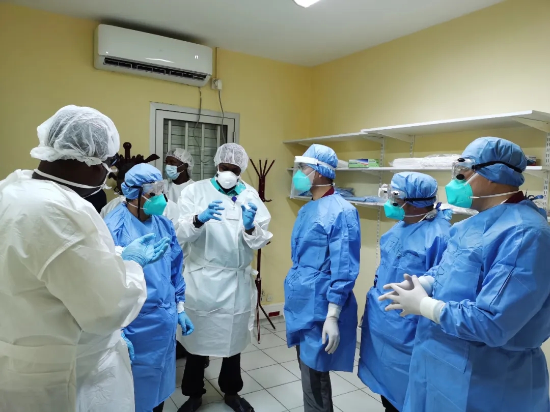 2020年5月2日,在吉布提布法医院,中国抗疫医疗专家组与吉方人员就大规模检测、无症状感染等问题进行交流。 新华社发(中国驻吉布提大使馆提供)