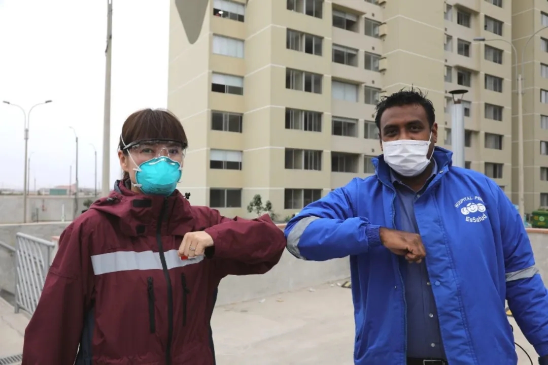 2020年5月24日,在秘鲁首都利马新冠肺炎临时隔离中心,中秘两国专家碰肘致意。 新华社/安第斯通讯社