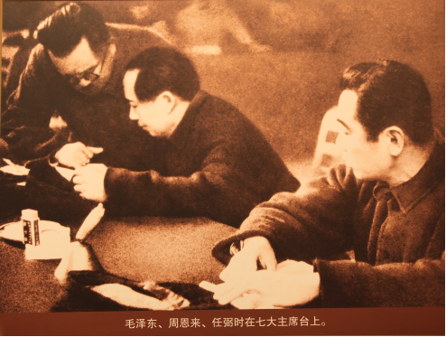 1945年4月23日至6月11日,中国共产党第七次全国代表大会在延安召开。大会确定了党的政治路线,通过了新党章。党章中第一次明确提出,以马克思列宁主义理论与中国革命的实践之统一的思想——毛泽东思想,作为党的一切工作的指针。图为毛泽东、周恩来、任弼时在大会主席台上。延安市委宣传部供图