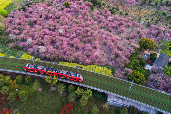 新发展理念的科学性已经在“强富美高”新江苏建设的五年答卷中得到印证。图为苏州高新区有轨电车在花中穿行。视觉江苏网供图 顾娟/摄