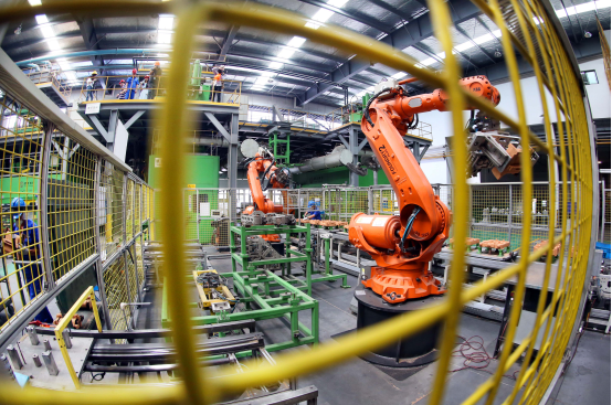 图为江苏省苏州市吴江区一企业生产车间里,机器人在操作铸造件。视觉江苏网供图 吴彬/摄