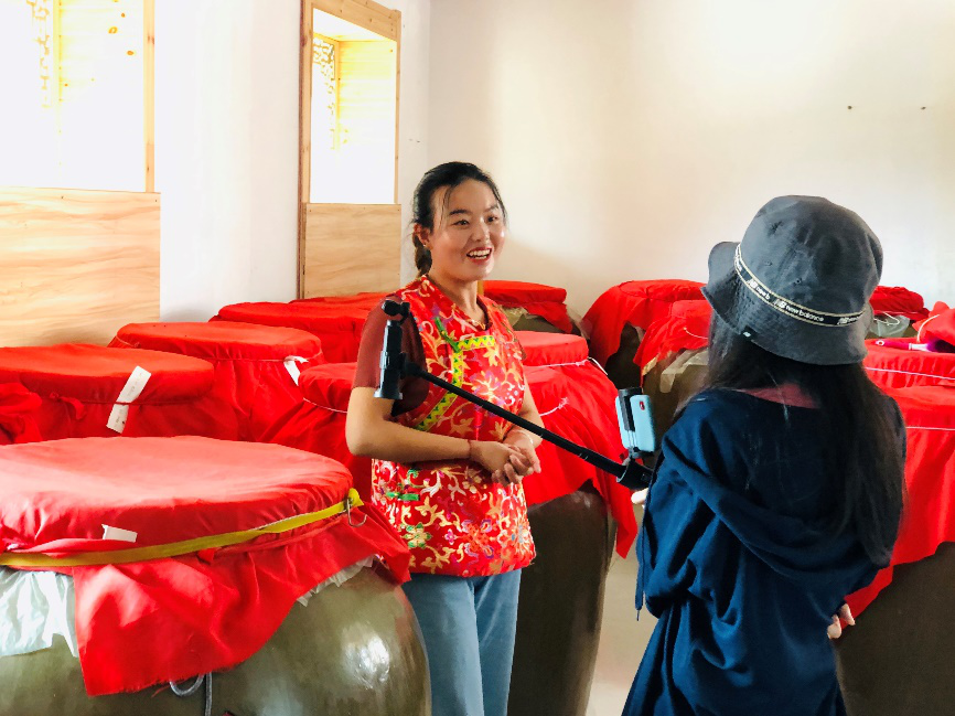 变身致富产业的土族特产,除了盘绣,还有酩馏酒。酩馏酒是土族群众用传统方法酿造的低度青稞酒,历史可以追溯到明末清初。这种酒气味醇香,清爽甘润,绵软舒心,有“开坛十里香”的美誉。2018年,班彦新村建成了酩馏酒坊,带动村里的10户农民加入,推动传统的酩馏酒酿造产业化。2019年初酒坊投入运营以来,为村集体经济增收4万元,农户户均增收3万元,为班彦农民增收致富开发了新渠道。今年年初,30岁的吕有兰不再到西宁市打工,回到村里的酒坊上班,主要负责销售业务。“我有了孩子,现在就想离家近。在这上班,能挣钱,又能照顾老人和孩子,多好啊!”吕有兰一家2016年从沙沟山搬到新村,现在和父母生活在一起,孩子已经3岁了。