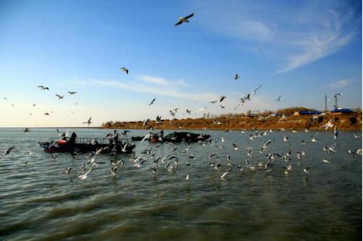河湖连通工程使203个湖泡全部连通,实现了生态补水,目前,查干湖3年就能实现一次水质转换,生物多样性得到了有效保护。图为渔船作业时,鱼鹰在湖面聚集盘旋。中共松原市委宣传部供图