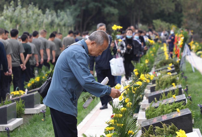 9月3日,甘肃省兰州市在市烈士陵园举行了烈士骨灰安葬启动仪式,烈士家属、部队官兵代表、参战老兵代表等社会各界人士共300余人参加了此次启动仪式。图为参加启动仪式的代表为烈士献花。新华社记者 张睿/摄