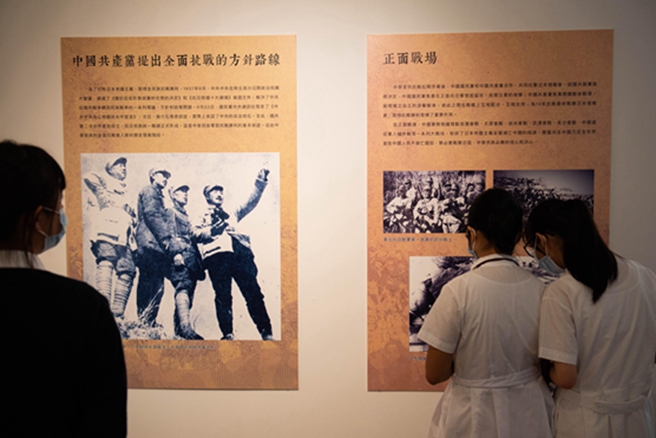 9月3日,“纪念中国人民抗日战争暨世界反法西斯战争胜利75周年展览”在澳门塔石艺文馆揭幕。展览展出70多幅珍贵历史图片,辅以简明的历史故事和图片说明,旨在普及抗战历史,加强爱国主义教育。图为澳门学生观看展览。新华社记者 张金加/摄