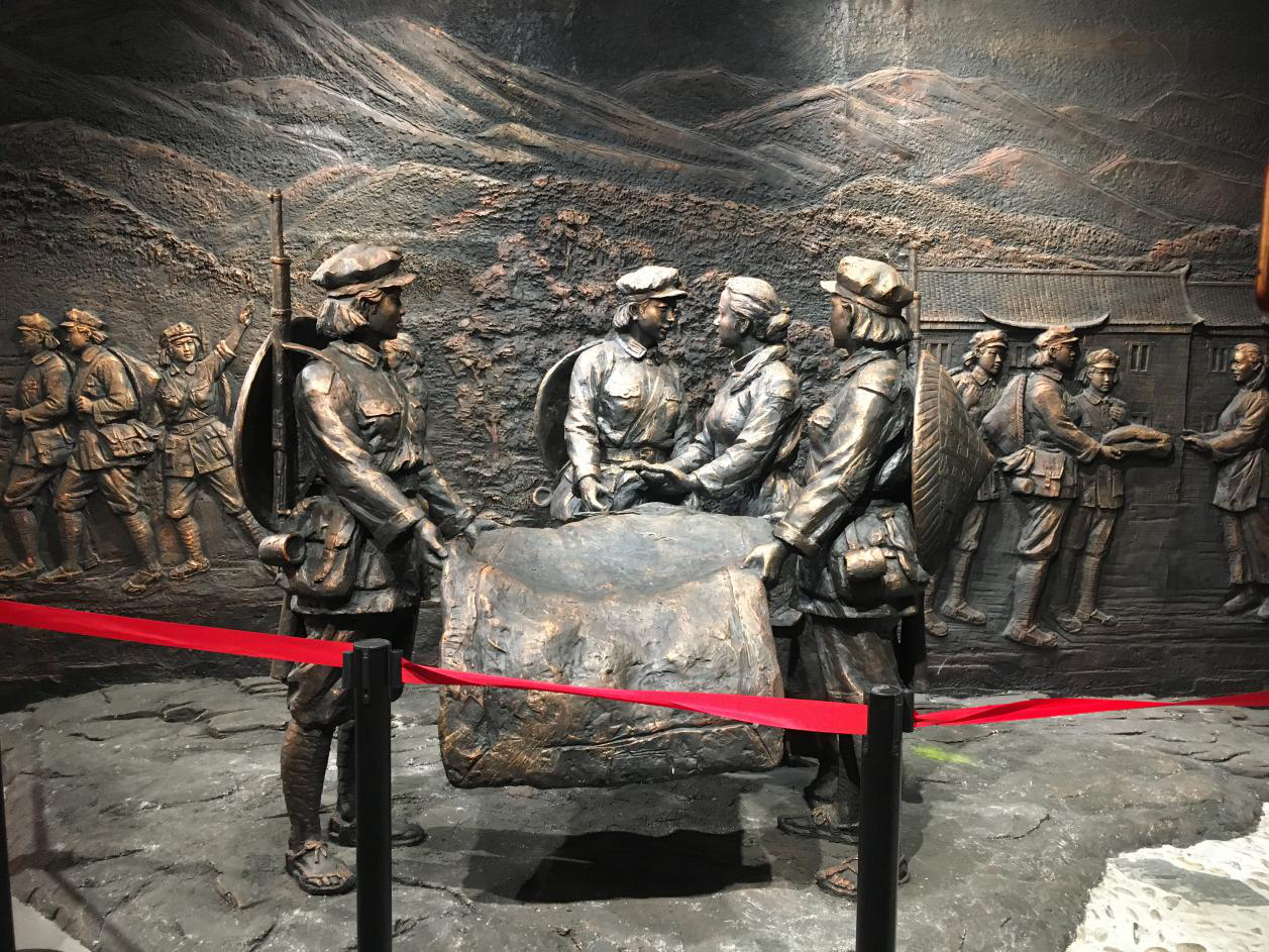 湖南省郴州市汝城县文明瑶族乡沙洲瑶族村“半条被子的温暖”专题陈列馆里的主题雕塑。