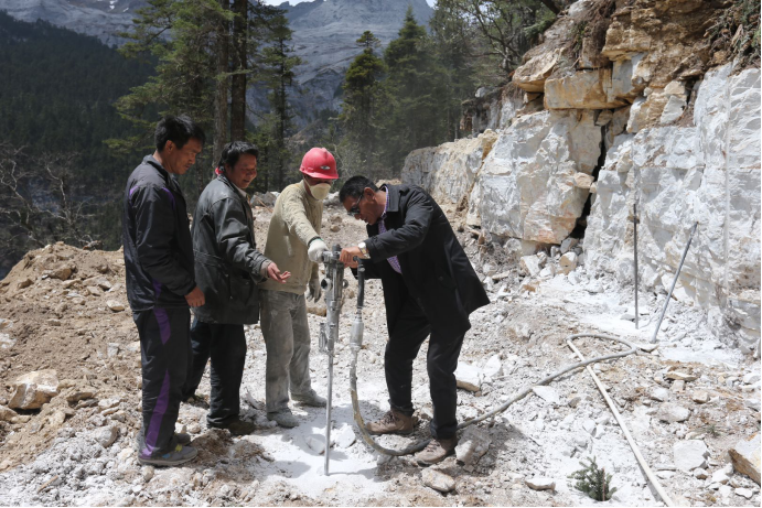 斯那定珠和工人一起修建香格里拉大峡谷内的公路 索朗农布/摄