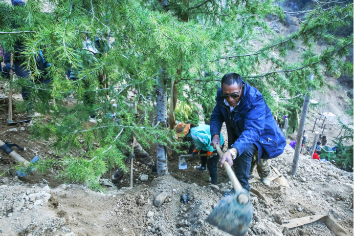新冠肺炎疫情期间,巴拉格宗景区关闭,斯那定珠投入2000多万购置了4万多棵树苗,带领200多个员工在景区植树。 索朗农布/摄