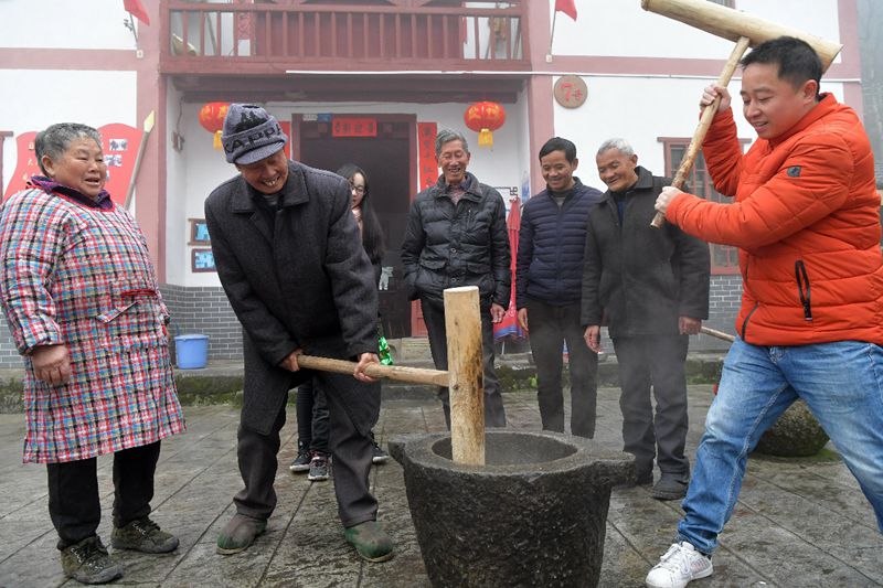 在茅坪乡神山村,左秀发(左二)和小儿子左春仁(右一)一起打糍粑。新华社供图
