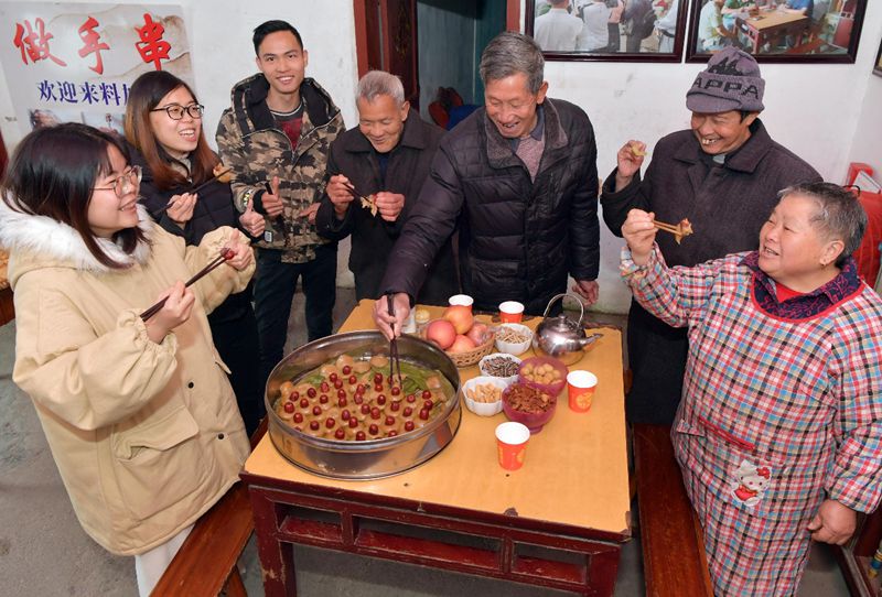 习近平总书记来村后几天,大年初一,在山外走亲戚的左香云接到父亲电话:从广东来的游客,不仅在他家门口抡起木槌打了糍粑,还提出想吃顿农家饭。左香云的妻子用自家过节的土菜备了一桌饭,没想到游客大加称赞。