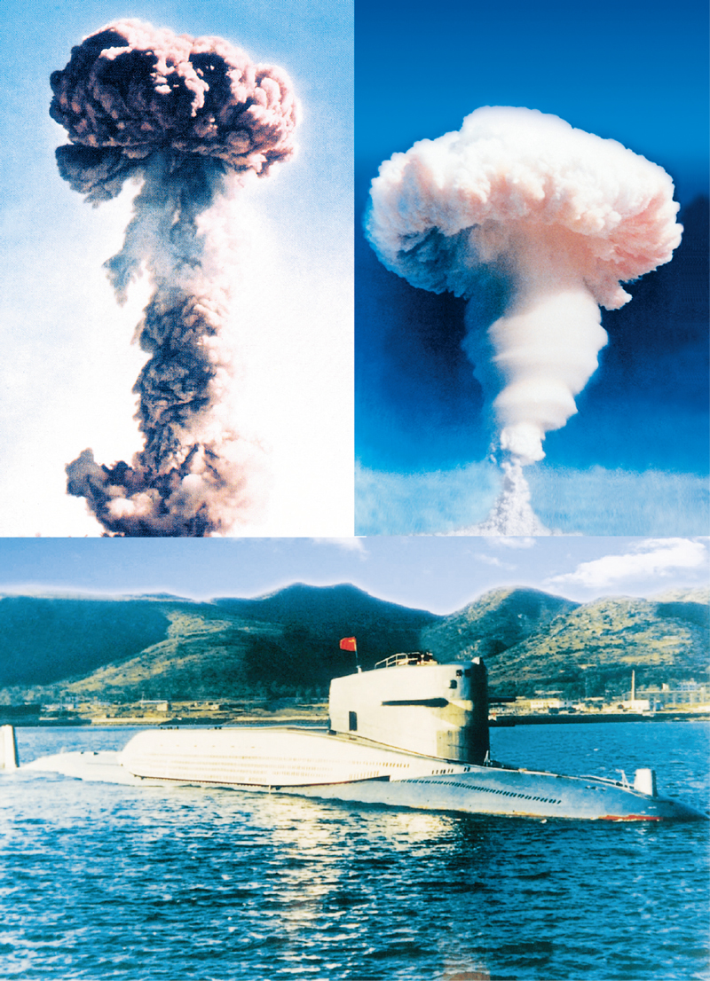 老一辈核工业人在极其艰苦的环境下,攻坚克难,自主创新,成功掌握了原子弹、氢弹、核潜艇等国之重器的关键核心技术,挺起了民族脊梁。1964年10月16日我国第一颗原子弹爆炸成功,1967年6月17日我国第一颗氢弹空爆试验成功,1970年12月26日我国第一艘核潜艇下水。上图左为原子弹爆炸情景,右为氢弹爆炸情景;下图为核潜艇航行场景。 中核集团供图