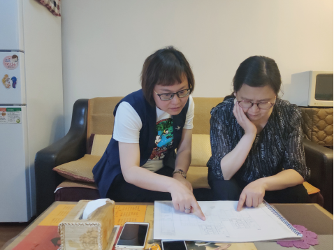 居民区党总支书记吕文洁上门向居民讲解设计方案 临汾路街道党工委 供图