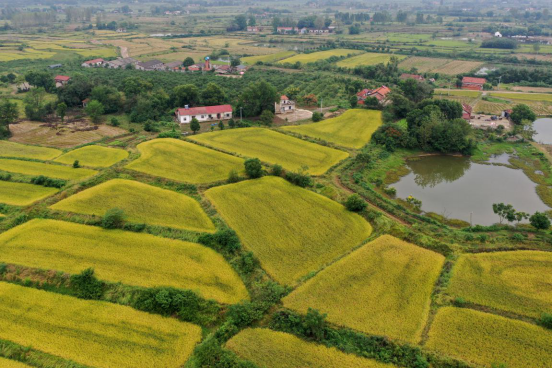 2020年9月23日,湖北省荆门市沙洋县曾集镇附近的水稻即将迎来丰收(无人机照片)。 彭琦/摄