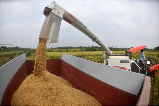 2020年9月23日,湖北省荆门市沙洋县曾集镇曾集村11组,种植大户朱中斌雇用收割机收获自家的水稻。 彭琦/摄