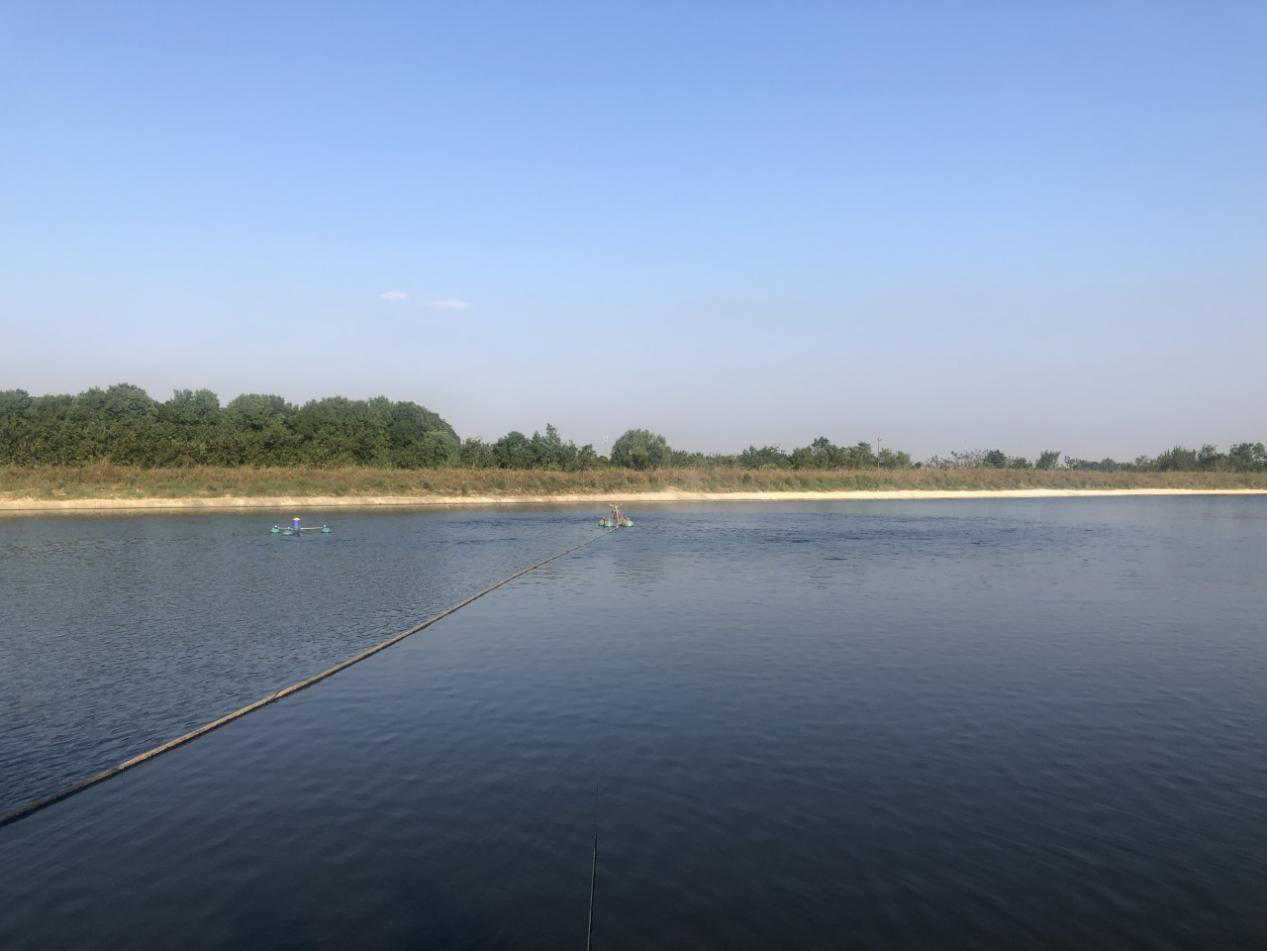 湖北省荆门市沙洋县金鑫惠家庭农场的鱼塘,农场主金义成的风送投料机正在向鱼塘内喷洒饲料。 姚瑜坪/摄