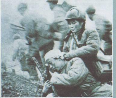 志愿军医务人员在火线为伤员包扎(资料图片)。