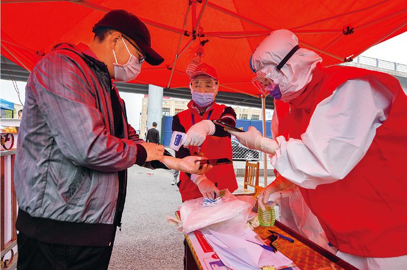 吉林省舒兰市发生聚集性新冠肺炎疫情后,300余名青年志愿者迅速集结,奔赴防疫一线。 图为2020年5月14日,在舒兰市弘林家园防疫卡点,青年志愿者为居民测温登记。 新华社记者 张楠/摄