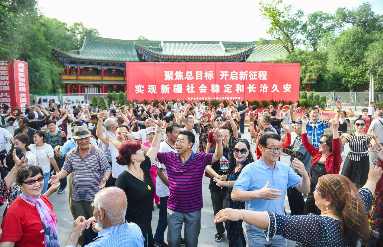 党的十八大以来,新疆各族群众安全感获得感幸福感明显增强。图为2018年6月的一天,乌鲁木齐人民公园里休闲娱乐的各族群众。中央统战部供图
