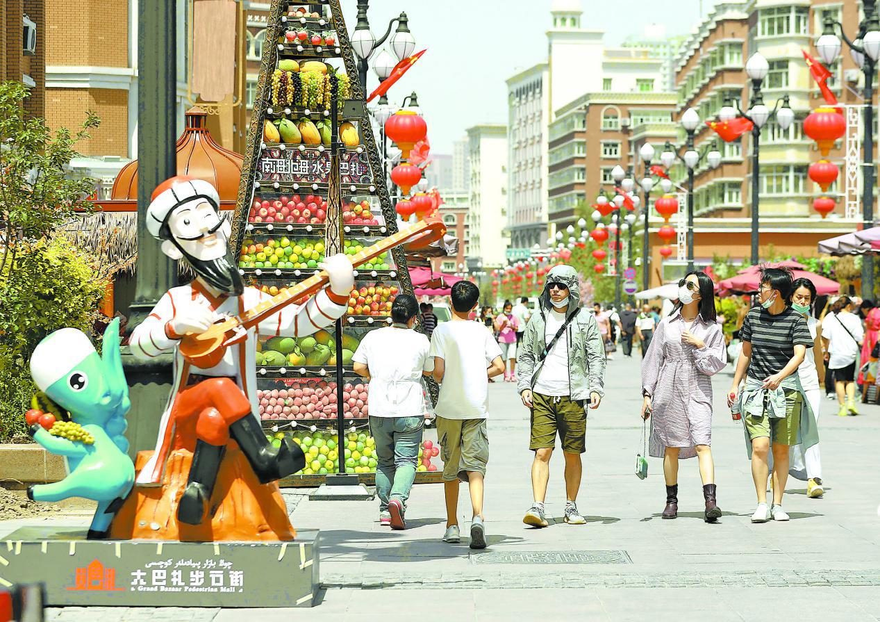 图为2020年7月,游客在新疆国际大巴扎景区步行街游览。中央统战部供图