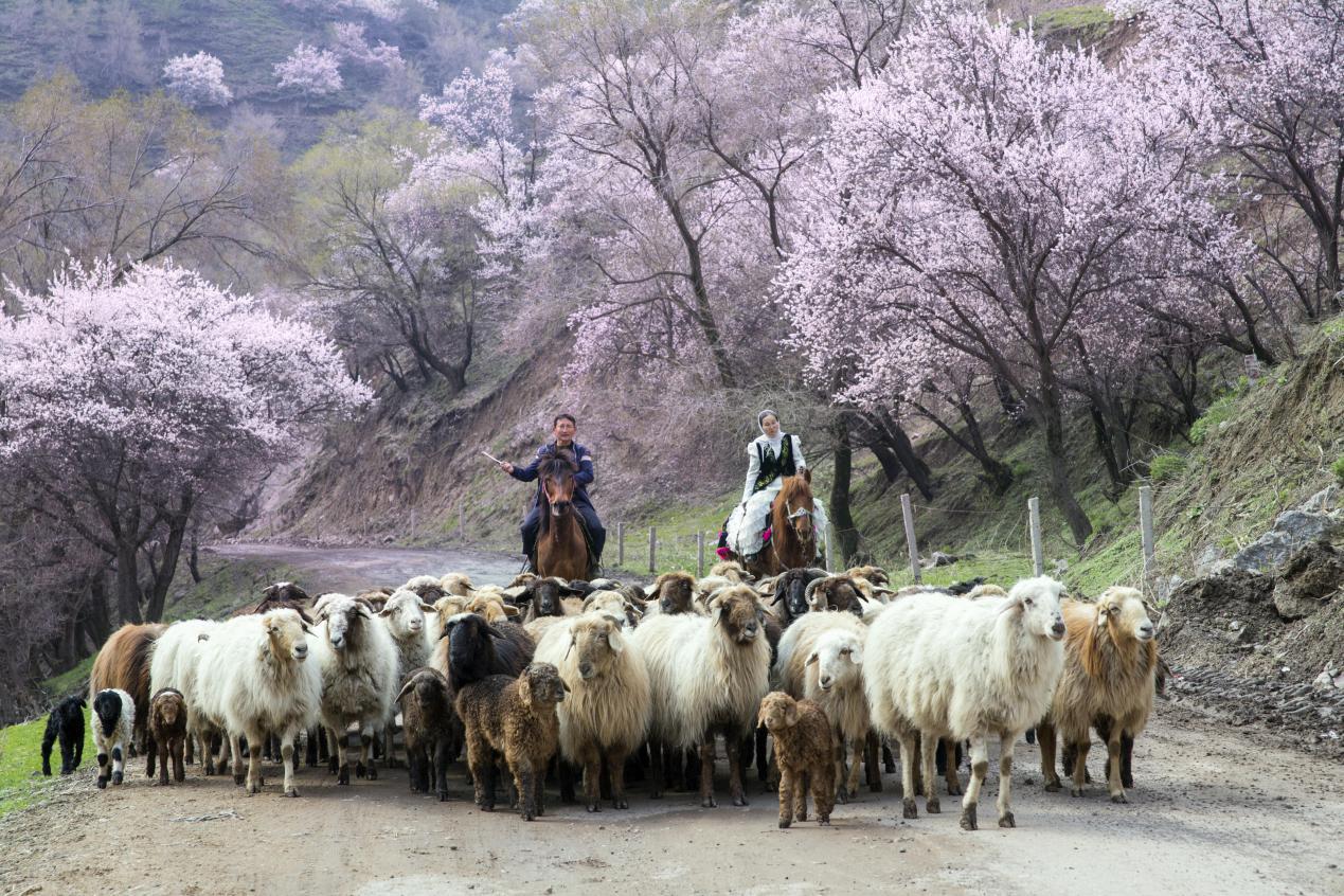 党的十八大以来,新疆打好精准脱贫攻坚战,贫困群众生产生活条件得到大幅改善。图为2016年初春,新疆一地牧民群众“赶着羊群奔小康”。中央统战部供图