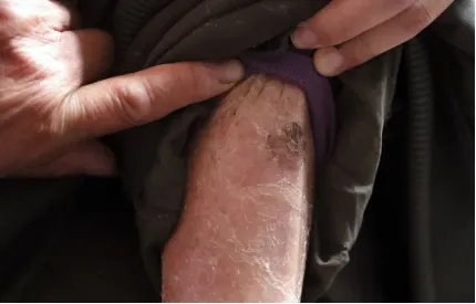 图为志愿军老战士孙景坤展示腿上的伤疤,他身上共有20多处伤疤。新华社记者 杨青/摄