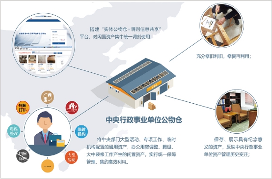2020年以来,国家机关事务管理局积极推动中央行政事业单位公物仓试点工作。公物仓试点工作开展以来,国务院国资委、生态环境部等部门将本单位闲置的办公设备家具近4000件纳入示范仓管理,全国政协办公厅、发展改革委等部门从公物仓调剂配备办公设备家具700多件,节约资产购置经费600余万元。图为中央行政事业单位公物仓运行模式和功能示意图。 国家机关事务管理局供图