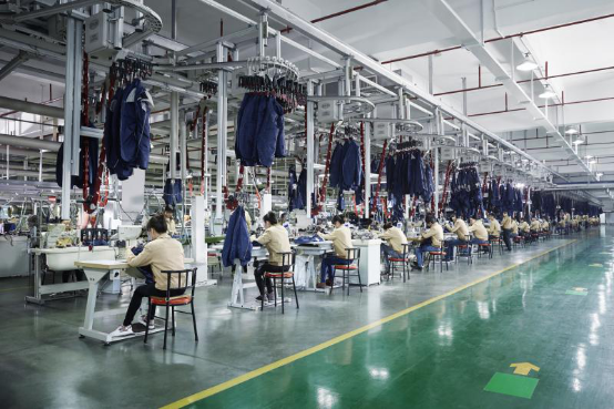 多年来,柒牌心无旁骛做实业,专心致志做好每一件衣服,这种坚守和积淀,使得柒牌能够在疫情防控最艰难的时刻短时间内转产防护服。图为柒牌服装生产车间,工人正在紧张忙碌地生产西装。 晋江市委宣传部供图