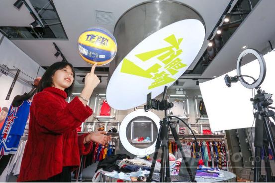 2020年4月2日,在福建泉州晋江万达商场一体育商品店内,店员在现场直播展示商品、秀才艺,利用云上平台进行推广销售。中新社发 仲雁铭