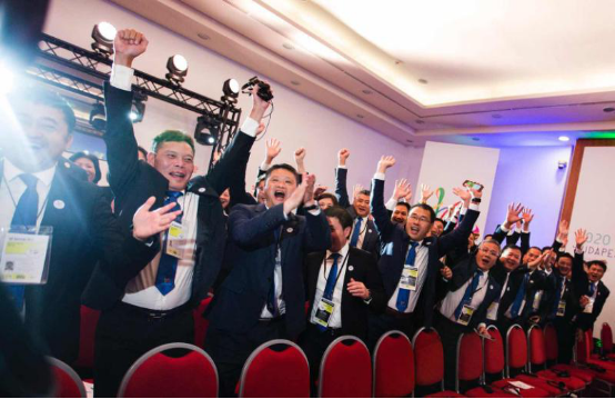 2017年,晋江20多位民营企业家和政府工作人员一起,赴意大利申请世界中学生运动会。图为国际中学生体育联合会主席郑重宣布“晋江为2020年第十八届世界中学生运动会举办城市”时的场景。 晋江市委宣传部供图
